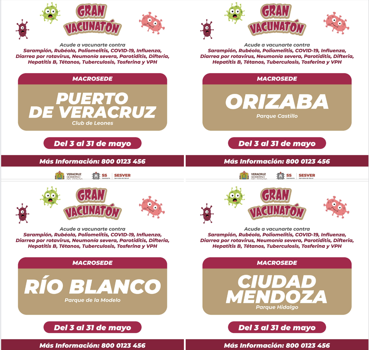 Redacción.- La Secretaría de Salud en el Estado informa a través de sus redes sociales que del 3 al 31 de mayo a través del programa denominado Vacunatón se estará atendiendo a la ciudadanía, administrando diversas dosis correspondientes al esquema universal de vacunación en los municipios de Orizaba, Río Blanco, Ciudad Mendoza y Veracruz puerto.
