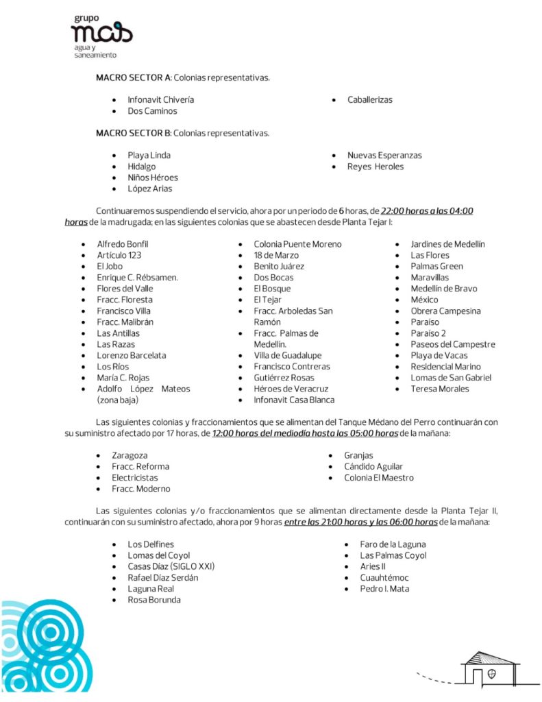 Para las 41 colonias, llegando hasta el municipio de Medellín de Bravo que se abastecen de la planta “El Tejar I”, se quedarán 6 horas sin agua, de 10 de la noche a 4 de la mañana.