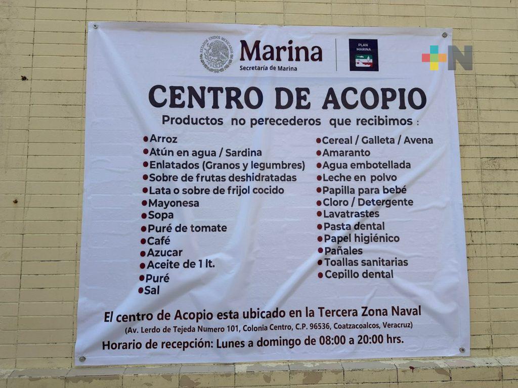 Y es que la Secretaría de Marina instaló un centro de acopio en su base de la Tercera Zona Naval ubicada en Avenida Lerdo de Tejada en Coatzacoalcos, donde reciben alimentos no perecederos en horario de 08:00 a 20:00 horas de lunes a domingo.
