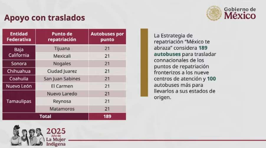 La titular de la Secretaría de Gobernación (Segob) añadió que la estrategia de repatriación “México te abraza” considera el uso de 189 autobuses para el traslado de las y los connacionales de los puntos de repatriación fronterizos a los nueve centros de atención, así como 100 vehículos más para llevarlos a sus lugares de origen.