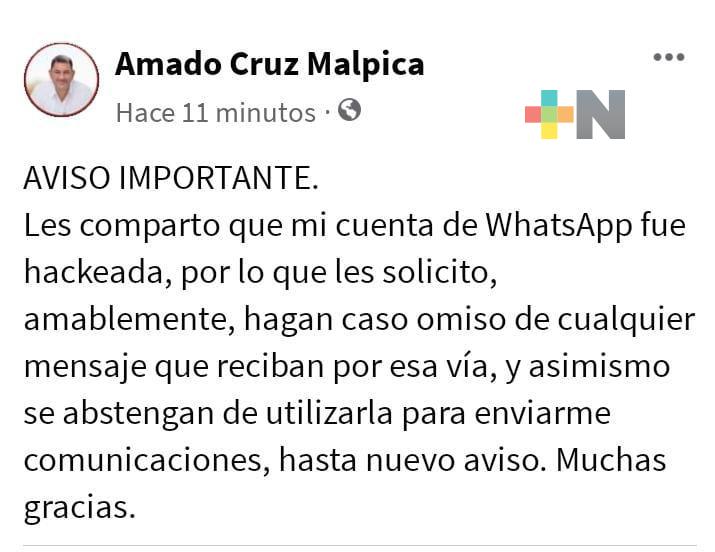 «Les comparto que mi cuenta de WhatsApp fue hackeada, por lo que les solicito amablemente, hagan caso omiso de cualquier mensaje que reciban por esa vía, asimismo, se abstengan de utilizarla para enviarme comunicaciones, hasta nuevo aviso. Muchas gracias», detalla el post en sus redes sociales.