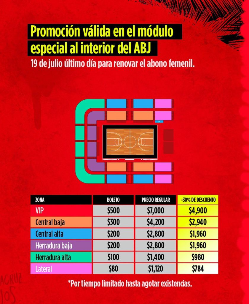 La promoción hace referencia a un descuento del 30% en la compra del Red Pass que incluye 14 juegos en el Auditorio “Benito Juárez”; cabe hacer mención que la directiva de la quinteta Roja mantiene los mismos costos de los boletos individuales del torneo femenil para la temporada varonil.