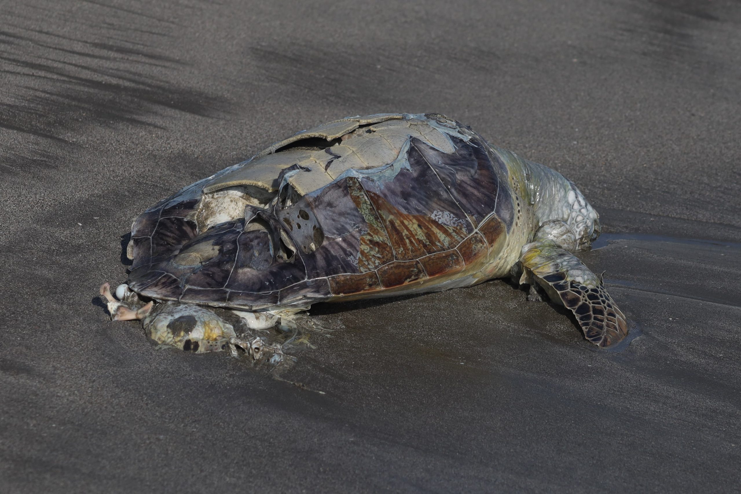 Trabajadores de limpia pública hallaron los restos de la tortuga muerta.