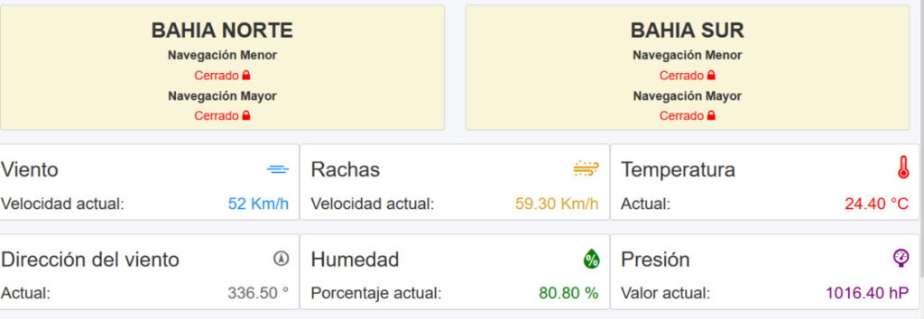 El centro meteorológico de Apiver señaló que están cerradas en este momento las bahías norte y sur, ya que se esperan vientos de hasta 110 kilómetros por hora en el municipio de Veracruz, conforme el día avance.