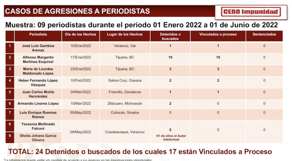 Señaló que en total hay 5 órdenes de aprehensión contra los ya identificados agresores de las comunicadoras, y aclaró que de estas 3 son nuevas, una de ellas es contra el autor intelectual.