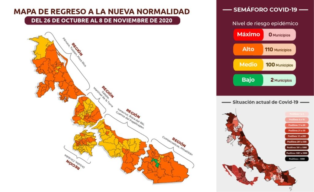 La Secretaría de Salud federal presentó este viernes el Semáforo de Riesgo Epidemiológico nacional, aplicable del lunes 26 de octubre al domingo 08 de noviembre; Veracruz se mantiene en color amarillo (riesgo medio).