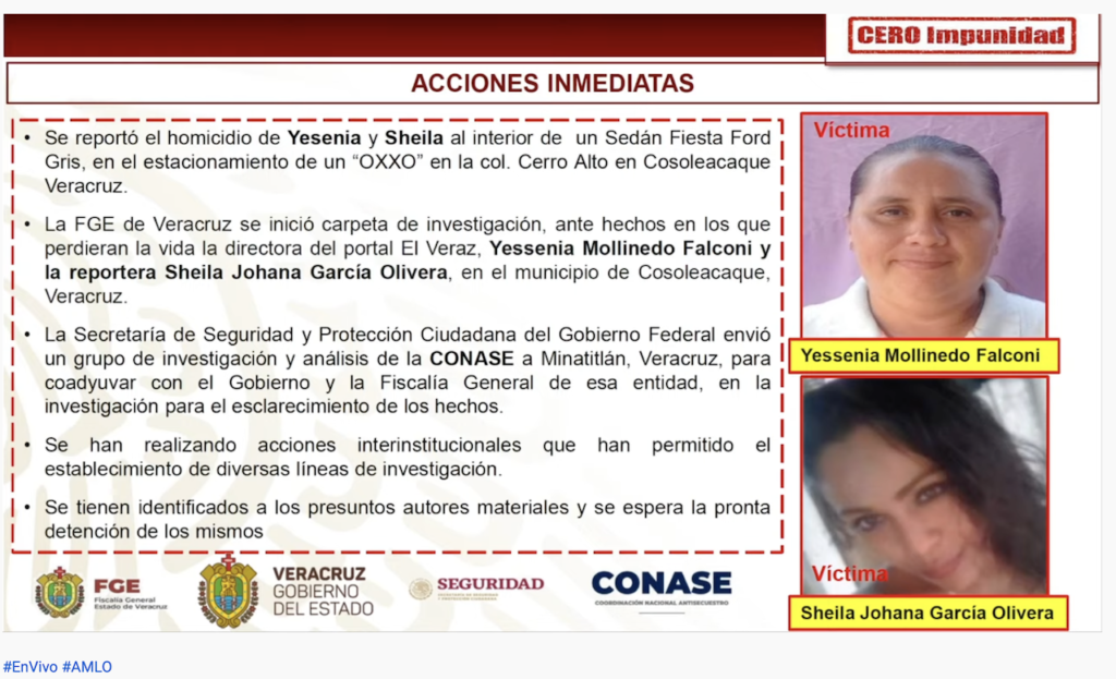 “La secretaria Rosa Icela estableció comunicación con el Gobernador Cuitláhuac de Veracruz, y por nuestra parte establecimos comunicación con el secretario de Gobierno y con la Fiscal General del Estado, se han realizado diferentes investigaciones, periciales y diversas técnicas de investigación.