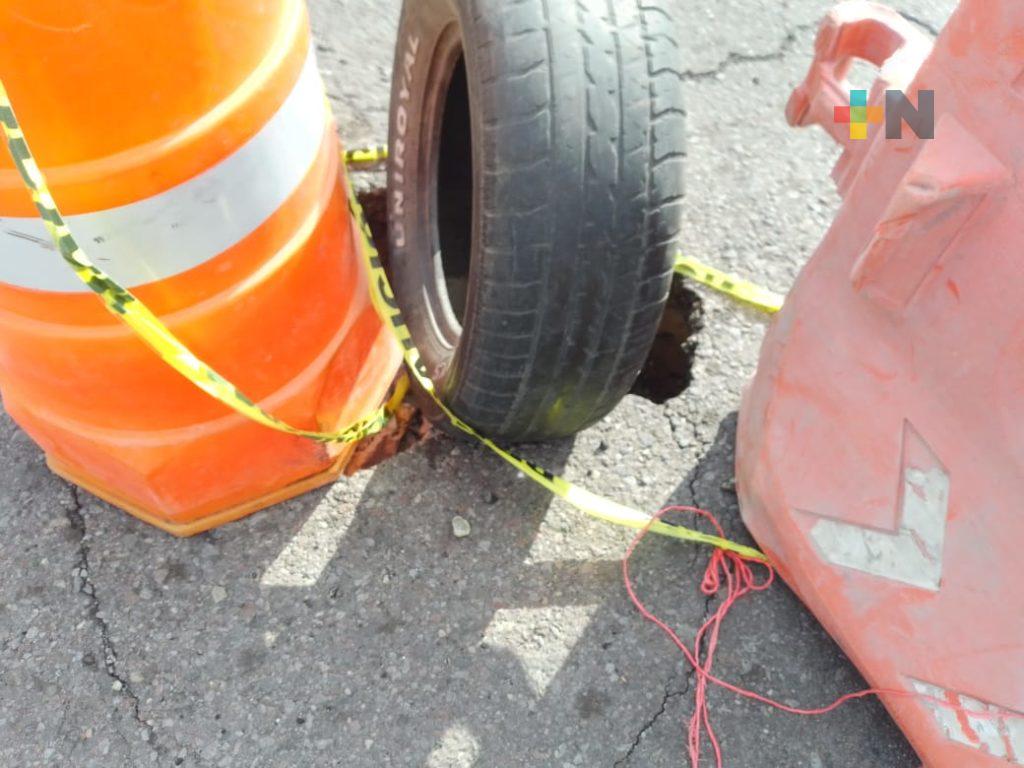 Ante la profundidad del espacio colocaron señalética y hasta una llanta para ver si el ayuntamiento de Veracruz, por medio de alguno de los trabajadores de las oficinas aledañas lo reporta y le brinda atención.