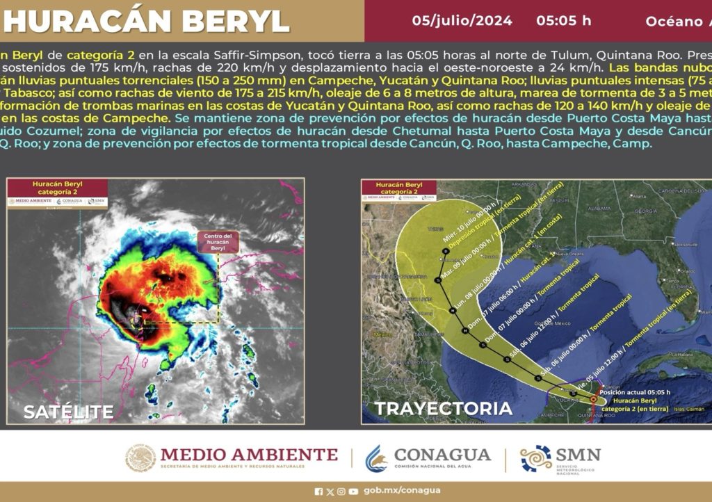 Redacción.- La madrugada de hoy viernes, a las 05:05 horas, tiempo del centro de México, el centro de Beryl tocó tierra como huracán categoría 2, en la escala Saffir-Simpson, con vientos máximos sostenidos de 175 kilómetros por hora y rachas de 220 kilómetros por hora al norte de Tulum, en Quintana Roo.