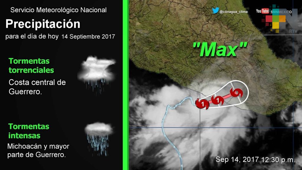 México.- El ojo del huracán Max categoría 1, está por ingresar a la costa chica de Guerrero a 35 kilómetros de Acapulco, informó el Servicio Meteorológico Nacional (SMN).