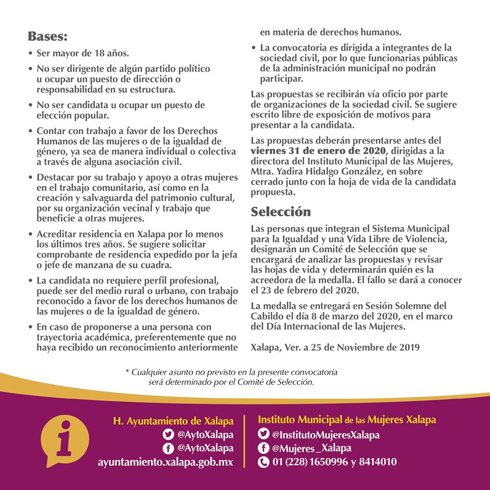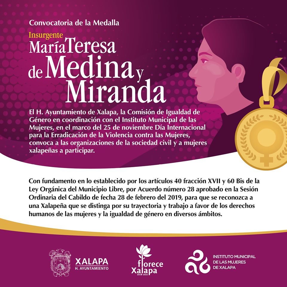 Xalapa, Ver.- La directora del Instituto Municipal de las Mujeres de Xalapa (IMMX), Yadira Hidalgo González, dio a conocer la convocatoria de la medalla, insurgente “María Teresa de Medina y Miranda”, para reconocer a una xalapeña que se distinga por su trayectoria y trabajo a favor de los derechos humanos de las mujeres y la igualdad de género en diversos ámbitos.