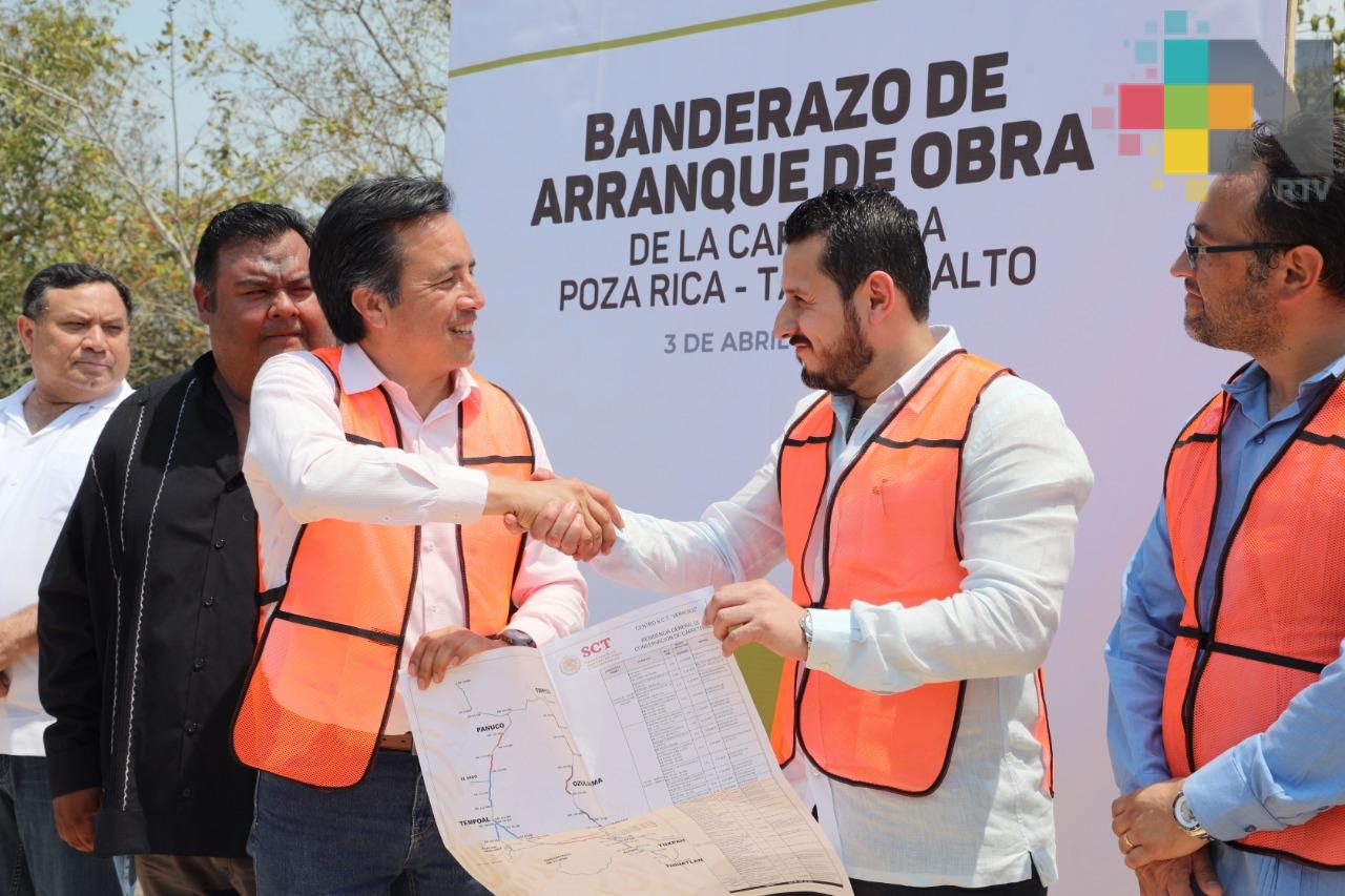 Por último, Cuitláhuac García dio el banderazo de inicio de la reconstrucción del tramo Poza Rica-Tampico Alto, donde anunció la inversión federal de 500 millones de pesos para la Carretera 180, que contempla al norte, centro y sur de la entidad; así como la rehabilitación de otros caminos que, en el caso de la región norte, abarcan los municipios de Tuxpan, Tantoyuca, Tempoal, El Higo y Platón Sanchez.
