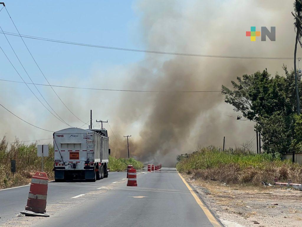 Coatzacoalcos, Ver.- Un fuerte incendio de pastizal se registró sobre la carretera Coatzacoalcos–Minatitlán, conocida como Las Matas lo que obligó al cierre de la vialidad por seguridad.