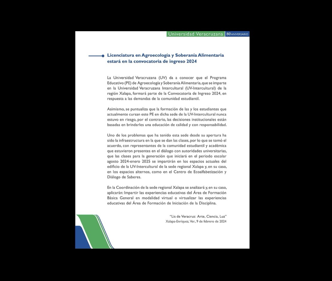 La UV dio a conocer que el Programa Educativo (PE) de Agroecología y Soberanía Alimentaria,que se imparte en la Universidad Veracruzana Intercultural (UV-Intercultural) de la región Xalapa, sí formará parte de la Convocatoria de Ingreso 2024, en respuesta a las demandas de la comunidad estudiantil.