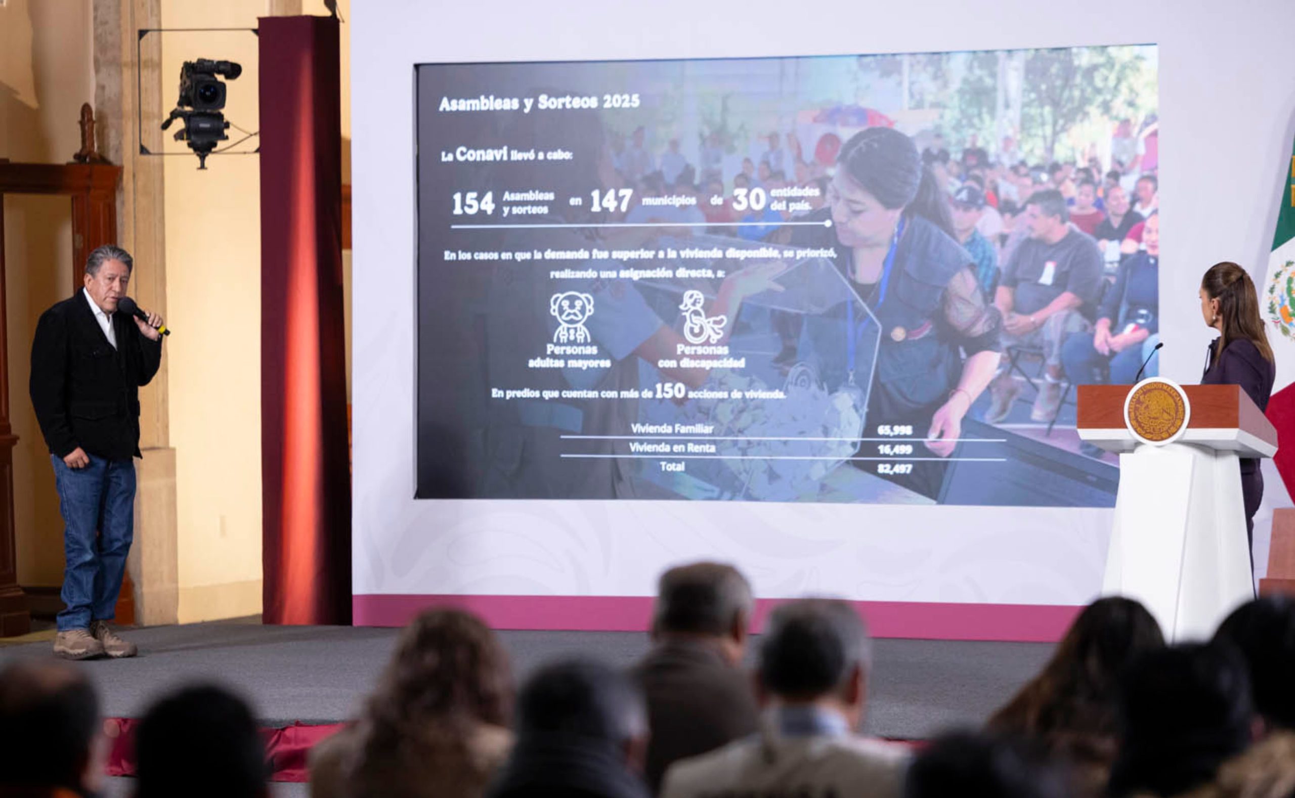 «¿Qué estamos pensando para el 26? Por ejemplo, en Tamaulipas vamos a llegar a 56, en Veracruz a 53, Quintana Roo igual a 53, Baja California 46 y así sucesivamente hasta llegar a las 404 mil viviendas que tenemos pensadas contratar en 2026».