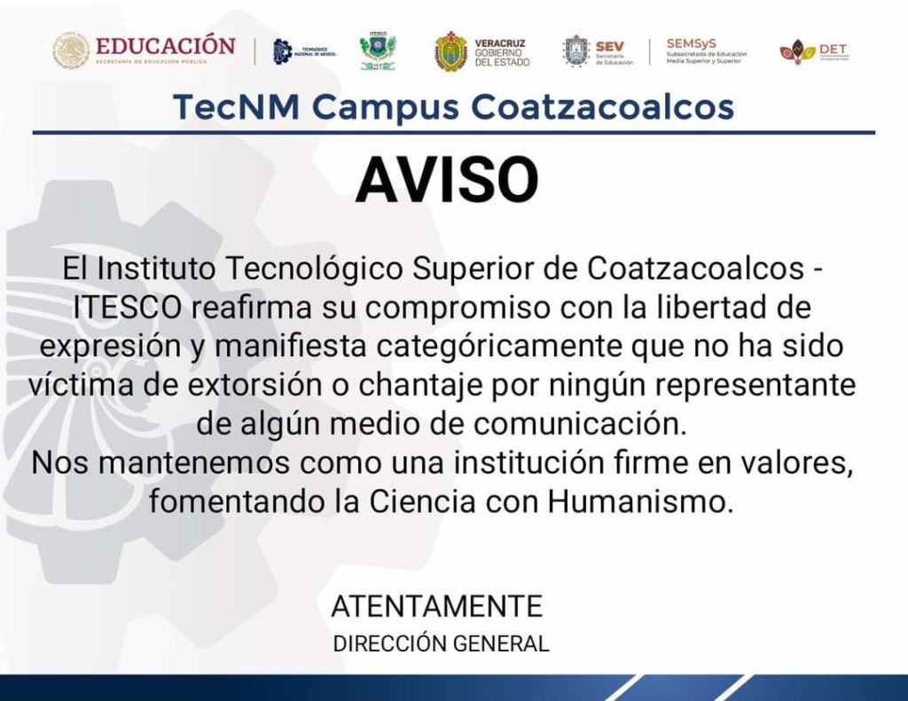 Coatzacoalcos, Ver.- Al tiempo de reafirmar su compromiso con la libertad de expresión, el Instituto Tecnológico Superior de Coatzacoalcos (ITESCO), informó que no ha sido víctima de extorsión o chantaje por algún representante de un medio de comunicación.