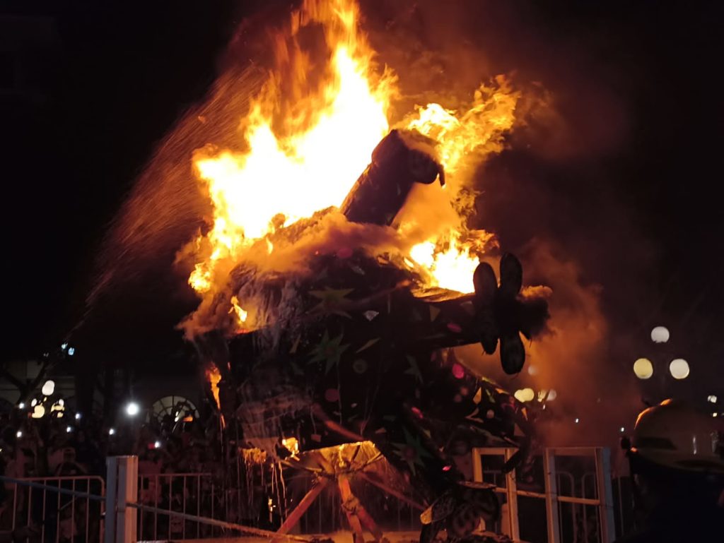 Veracruz, Ver.- Minutos después de las 9 de la noche una figura que representó al virus que provoca el COVID-19, ardió en llamas en el Zócalo de la Ciudad de Veracruz como parte de la tradicional quema del mal humor del Carnaval.