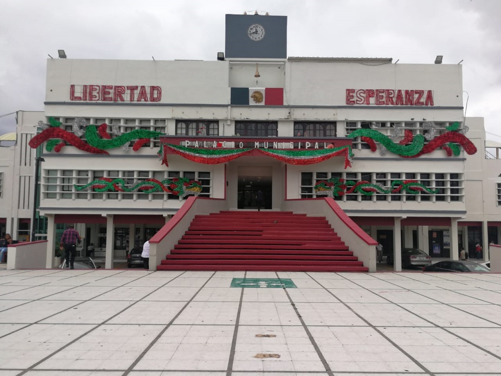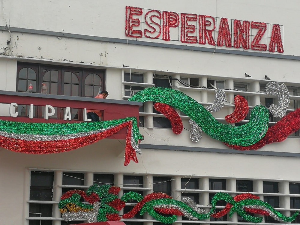 Personal de Obras Públicas y servicios generales se encargan de rehabilitar con pintura la fachada del ayuntamiento, además de colocar artículos al mes patrio.