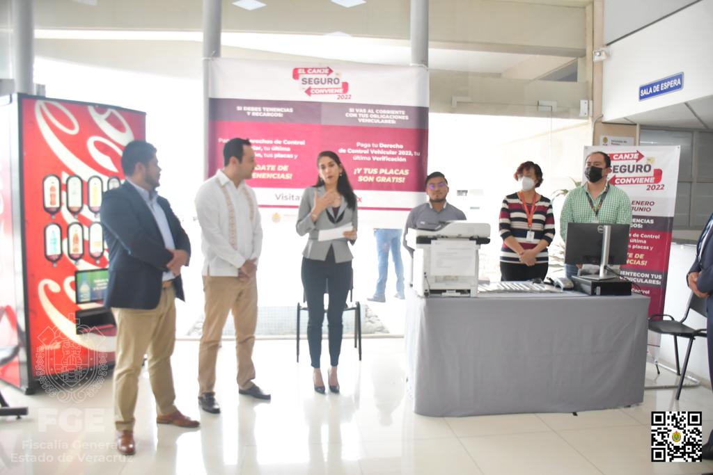 Xalapa, Ver.- La Fiscal General del Estado, Verónica Hernández Giadáns y el Secretario de Finanzas y Planeación del Gobierno del Estado, José Luis Lima Franco, dieron inicio formal a la operación del módulo del programa de reordenamiento vehicular “El Canje Seguro Conviene 2022”, en las oficinas centrales del organismo autónomo.