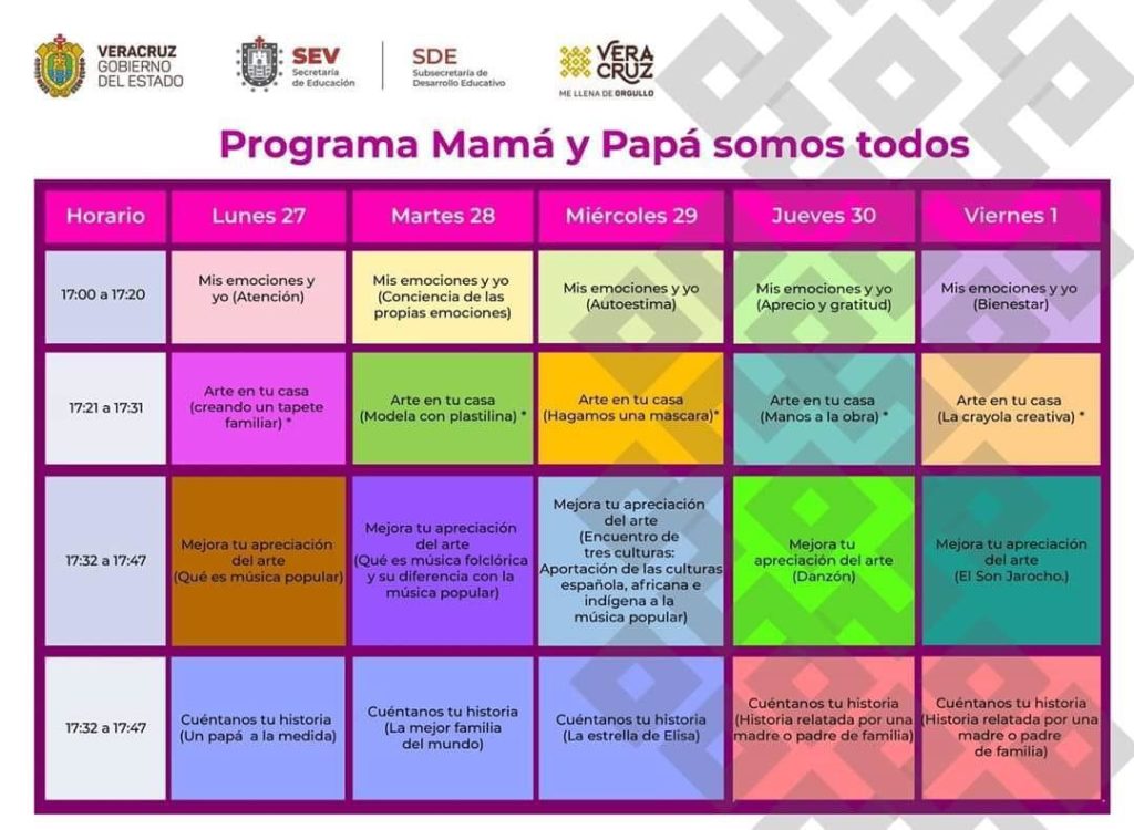 Xalapa, Ver.- La Secretaría de Educación de Veracruz (SEV), a través de la Subsecretaría de Desarrollo Educativo, creó el programa radiofónico “Mamá y Papá somos todos”, el cual se transmite de lunes a viernes, a las 17:00 horas, por Radio Más de Radiotelevisión de Veracruz (RTV).