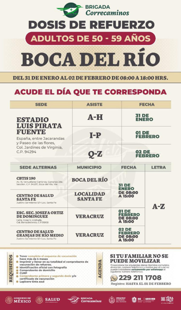 Boca del Río, Ver.- Del 31 de enero al 2 de febrero del año en curso se aplicará la dosis de refuerzo a la población de 50 a 59 años del municipio de Boca del Río, con el inmunológico AstraZeneca.