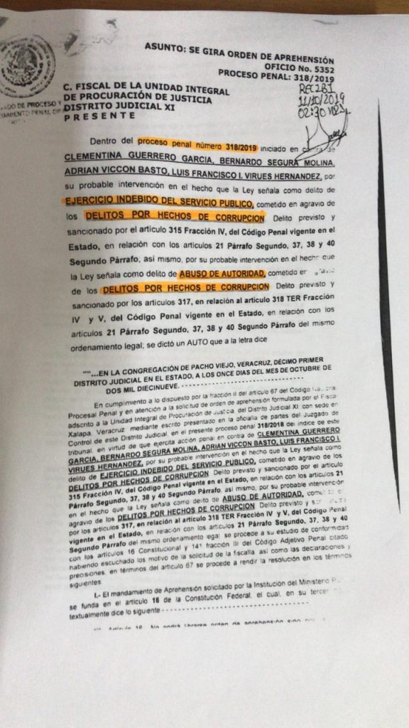 Xalapa, Ver.- Por los delitos de ejercicio indebido del servicio público y abuso de autoridad, la Fiscalía General del Estado inició el proceso penal número 318/2019 en contra de Clementina Guerrero García, Bernardo Segura Molina, Adrián Viccon Basto y Luis Francisco I. Virues Hernández, por su probable intervención en los delitos antes mencionados.