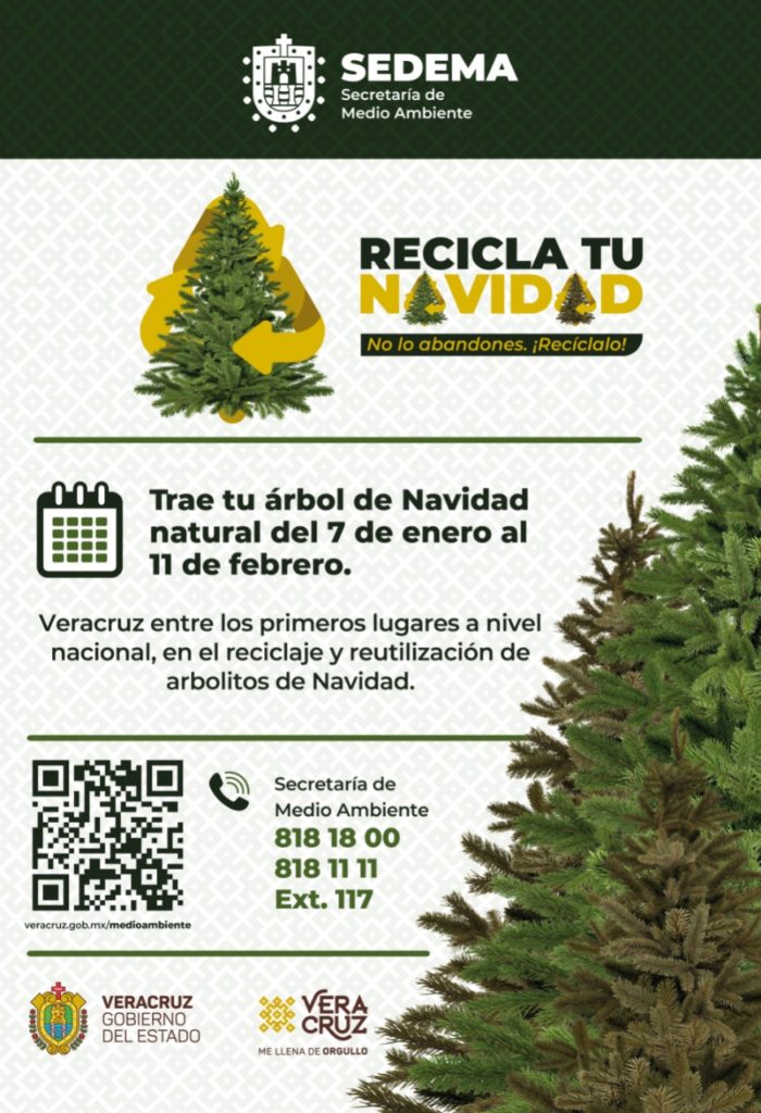 Xalapa, Ver.- A partir de este viernes 7 de enero inicia la campaña “Recicla tu Navidad”, para ello, la Secretaría de Medio Ambiente en Veracruz (Sedema) habilitó 64 centros de acopio en varios municipios del estado de la zona sur, centro y norte, para que la población lleve sus pinos navideños y se les dé un uso ecológico.