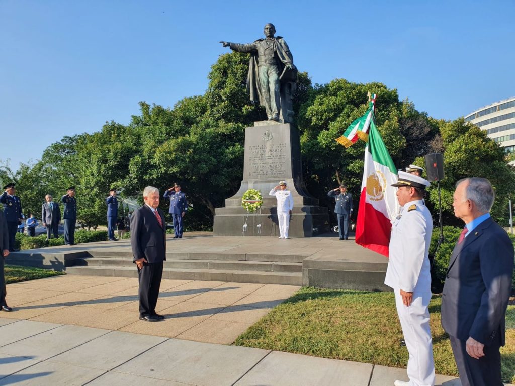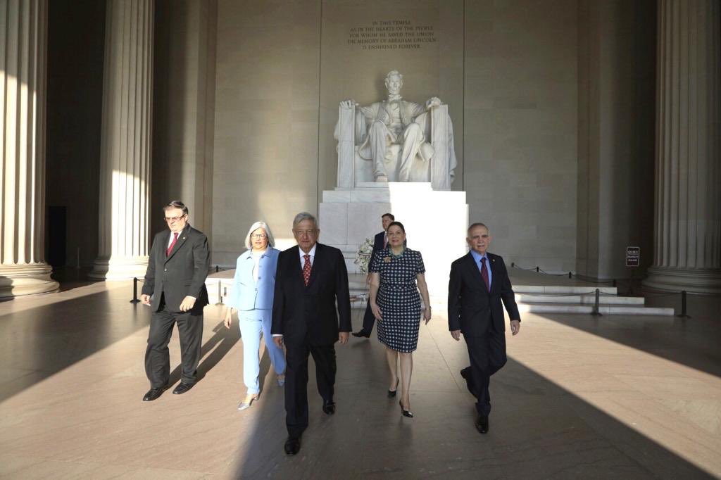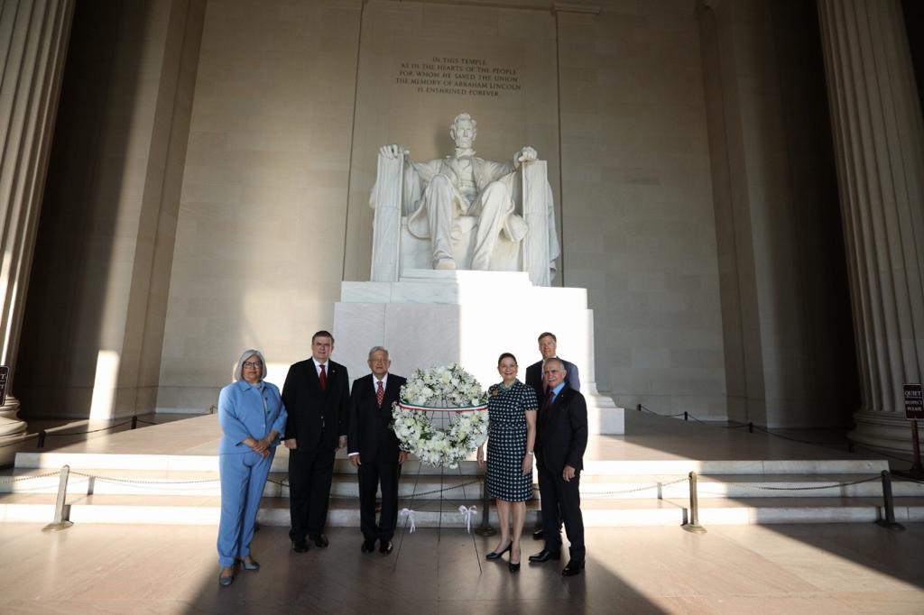 Washington.- Como parte de su visita de trabajo en Washington, el presidente Andrés Manuel López Obrador colocó ofrendas florales en los monumentos a Abraham Lincoln y a Benito Juárez, quienes representan lo mejor de la política y la lucha por las libertades en ambas naciones.