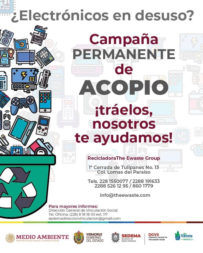Xalapa, Ver.- Con el respaldo de la empresa The Ewaste, la Secretaría de Medio Ambiente (Sedema) del estado, instaló un centro de acopio permanente de desechos electrónicos y opera desde este martes en la ciudad de Xalapa, donde la población puede llegar y llevar sus desechos electrónicos, indicó la titular de la dependencia, María del Rocío Pérez Pérez.