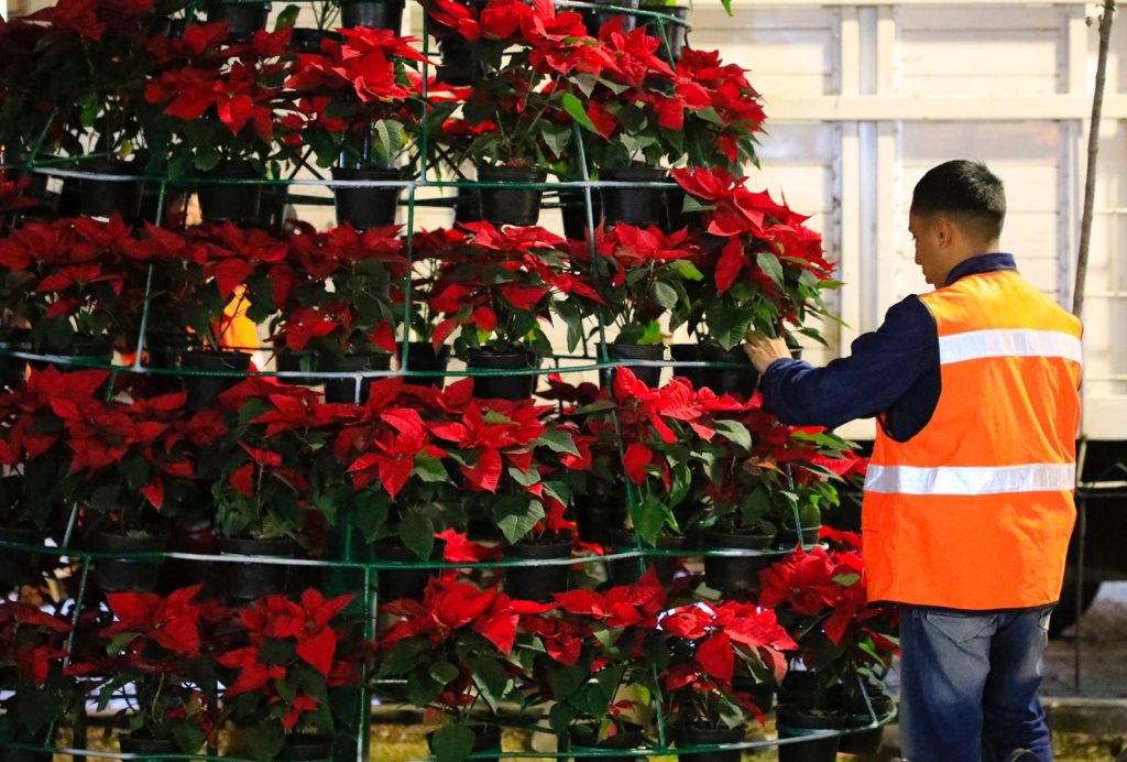 Este miércoles por la noche, se instaló en la Plazuela del Carbón un pino conformado con 121 plantas de nochebuena sobre una base de herrería, así como un cometa iluminado con la “X” de Xalapa.