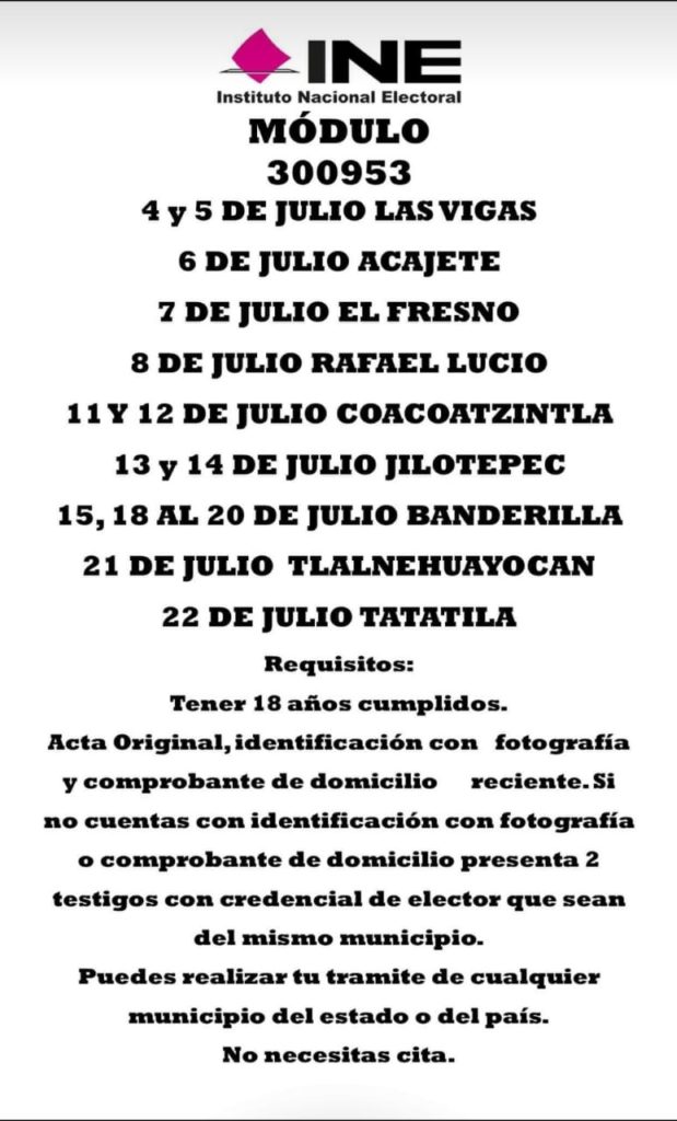 Este jueves estarán aun en Jilotepec, pero de ahí estarán en Banderilla, Tlalnelhuayocan y Tatatila acercando los servicios del INE a la población y así poder renovar su credencial de elector.