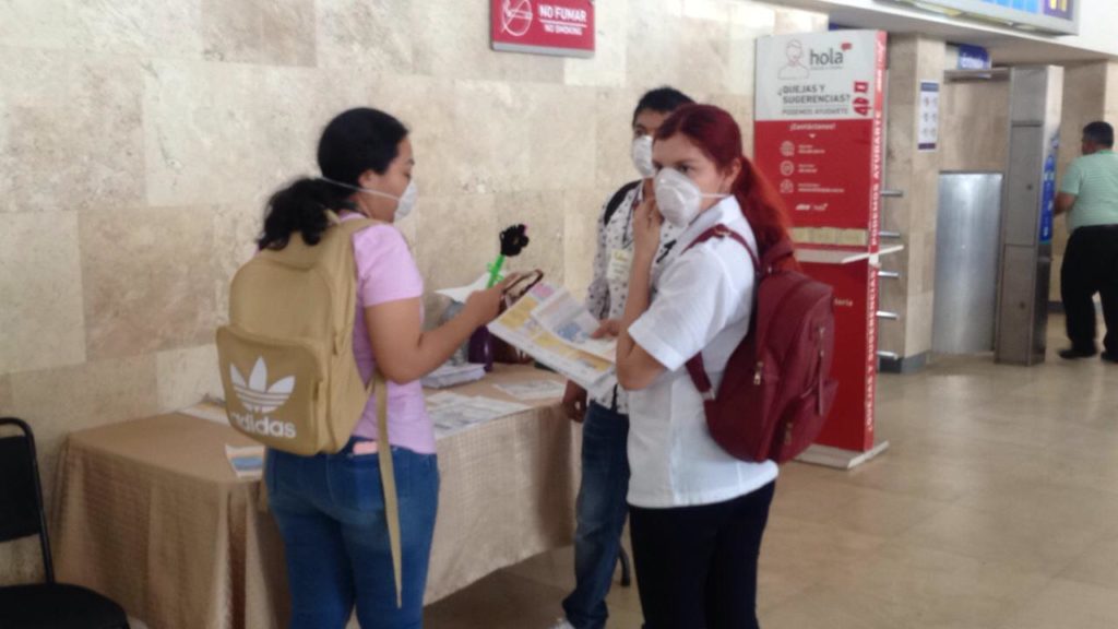 Personal de la Secretaría de Salud de Veracruz da información preventiva sobre el Covid-19 a los pasajeros que acuden a la terminal de primera y segunda de la ciudad.