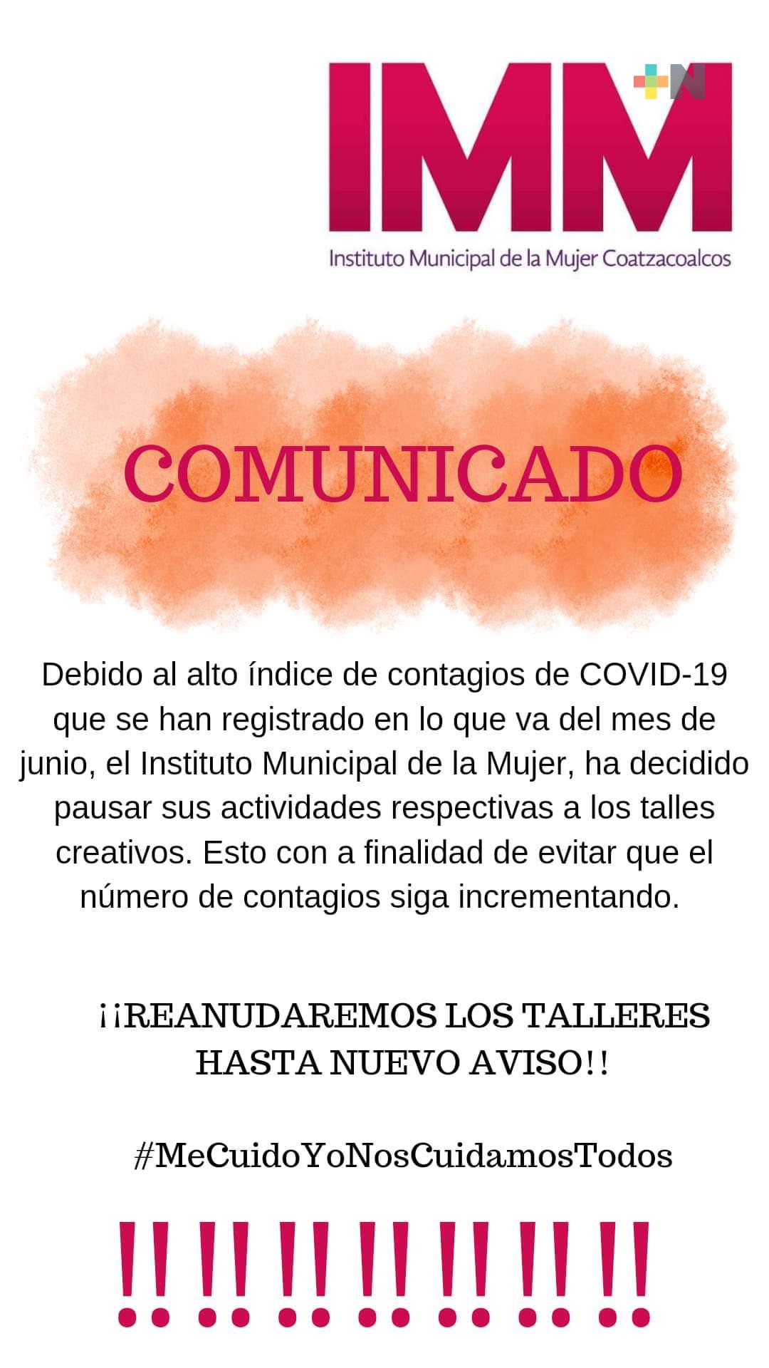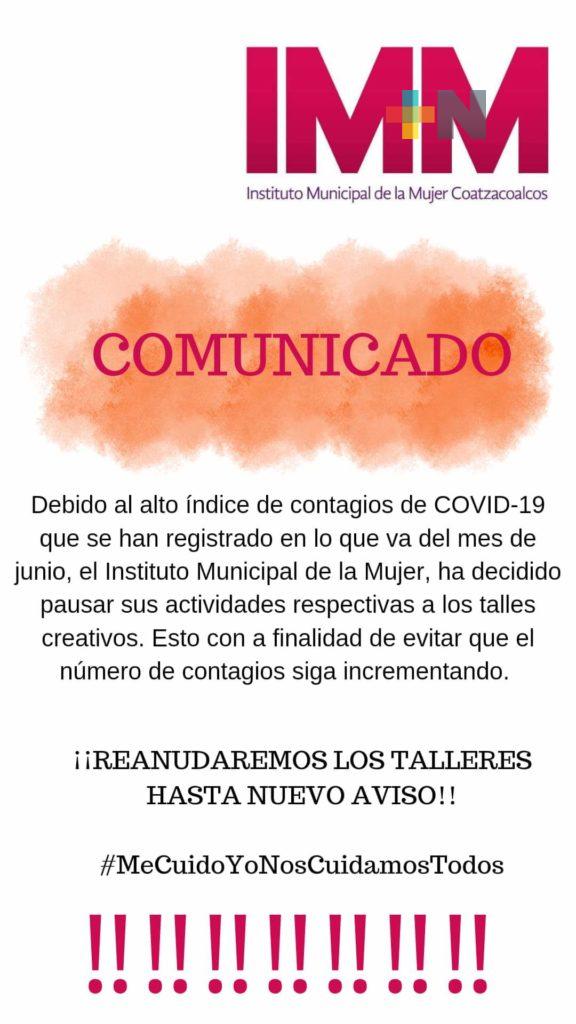 “Debido al alto índice de contagios de Covid-19 que se han registrado en lo que va del mes de junio, el Instituto Municipal de la Mujer, ha decidido pausar sus actividades respectiva a los talleres creativos, esto con la finalidad de evitar que el número de contagios siga incrementado”, se lee en el comunicado.