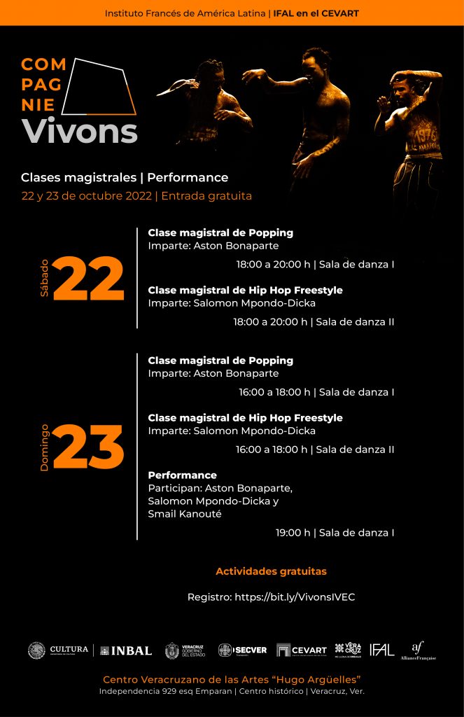 Veracruz, Ver.- El Instituto Veracruzano de la Cultura a través del Centro Veracruzano de las Artes “Hugo Argüelles”, en conjunto con la Coordinación Nacional de Danza del Instituto Nacional de Bellas Artes y Literatura (INBAL), el Instituto Francés de América Latina (IFAL) y la Embajada de Francia en México, invitan a participar en el ciclo de actividades que la compañía de danza francesa Compagnie Vivons llevará a cabo de manera gratuita el sábado 22 y domingo 23 de octubre en las salas del CEVART.