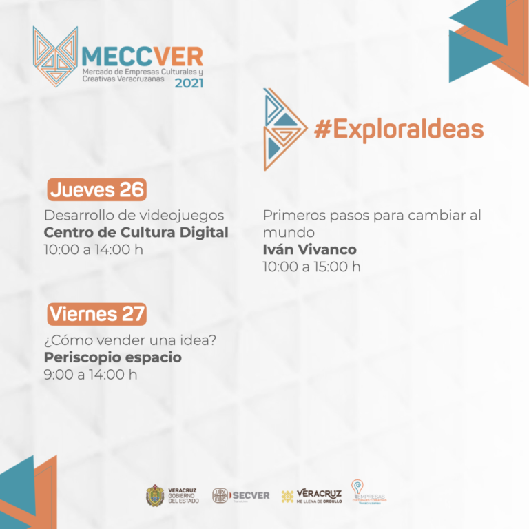 El MECCVER 2021 se realizará del lunes 23 al sábado 28 de agosto, a través de la página de Facebook de Empresas Culturales y Creativas IVEC: @EmpresasCulturalesIVEC. Las y los interesados en participar en el Mini Game Jam e inscribirse a los talleres de #ExploraIdeas pueden realizar el proceso de registro a través del sitio web ecc.ivec.gob.mx.