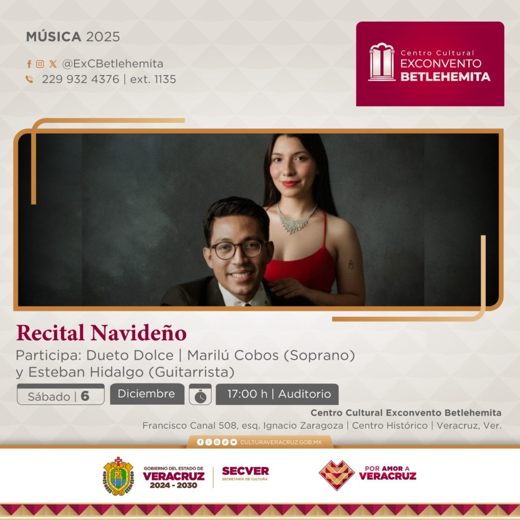 Por la tarde, a las 17:00 horas, el Dueto Dolce, conformado por la soprano Marilú Cobos y el guitarrista Esteban Hernández Hidalgo, quienes ofrecerán un Recital Navideño con un programa que incluye música clásica y sacra, agregando un toque festivo y de gran calidad artística para deleite de los asistentes.