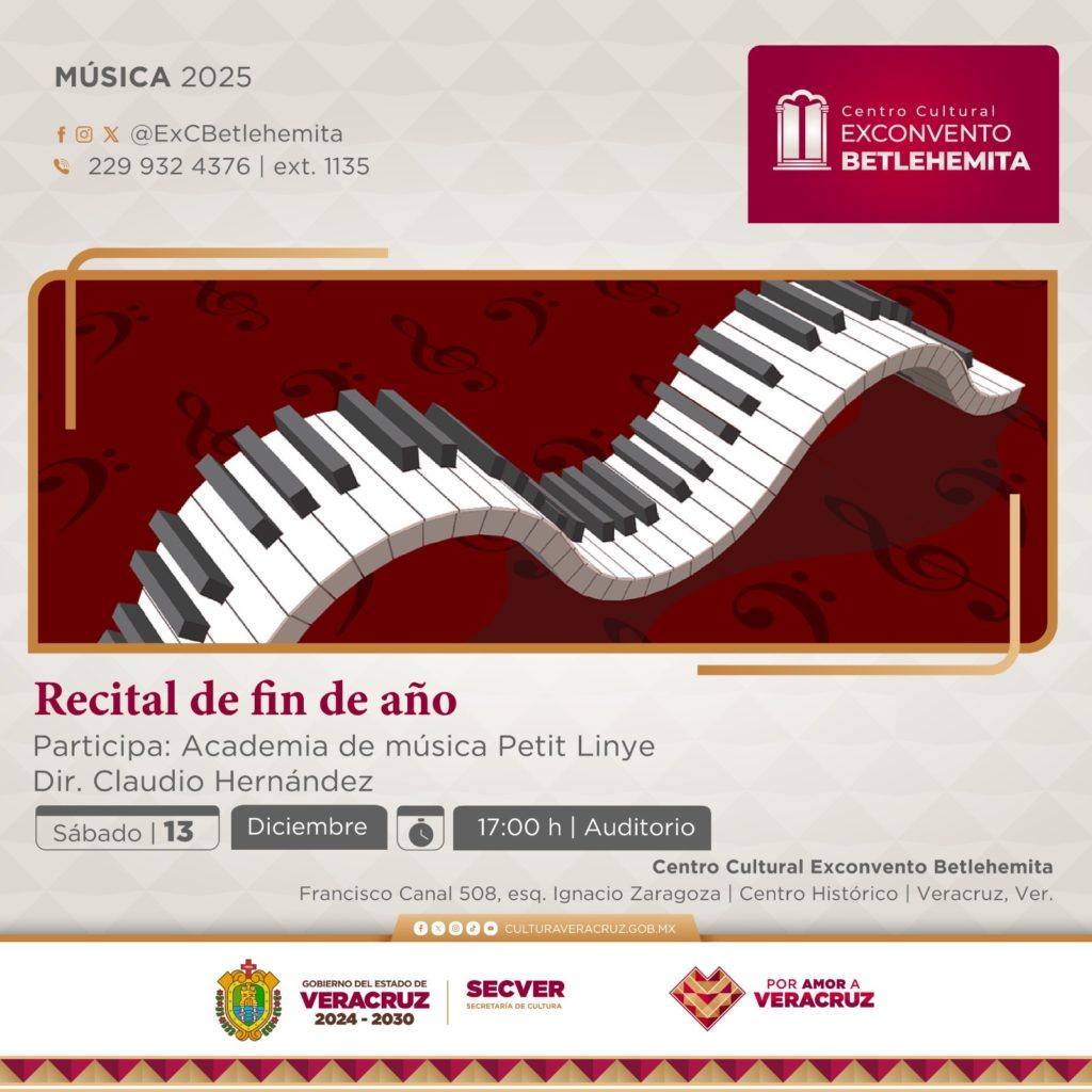 Xalapa, Ver.- La Secretaría de Cultura de Veracruz (SECVER) invita a disfrutar de los diferentes recitales navideños que escuelas y academias de música presentarán durante el mes en el Centro Cultural Exconvento Betlehemita del puerto de Veracruz. La entrada es libre.