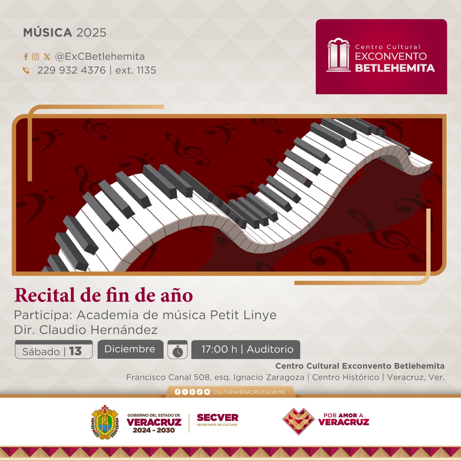 Finalmente, el sábado 13 de diciembre, a las 17:00 horas, el Recital de Fin de Año a cargo de la Academia de Música Petit Linye, bajo la dirección de Claudio Hernández. Los y las estudiantes de esta academia compartirán los logros y progresos obtenidos en su formación musical a lo largo del año, para concluir con un recital lleno de amor por el arte y la música.