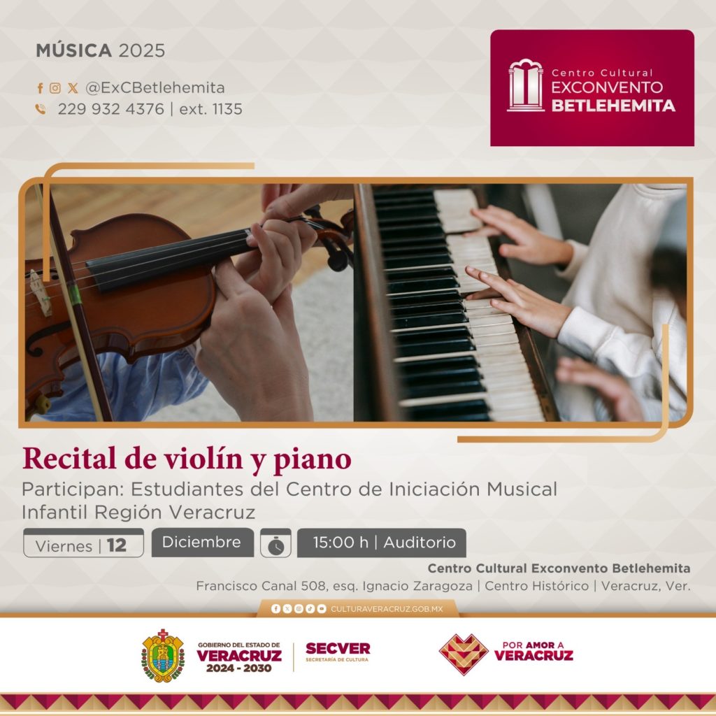 El viernes 12 de diciembre, a las 15:00 horas, se contará con la participación de estudiantes del Centro de Iniciación Musical Infantil de la Universidad Veracruzana, con un Recital de piano y violín, que ofrecerá la oportunidad de apreciar el enfoque de dicho centro en el desarrollo de habilidades auditivas, intelectuales y motrices de las y los menores de 7 a 14 años.