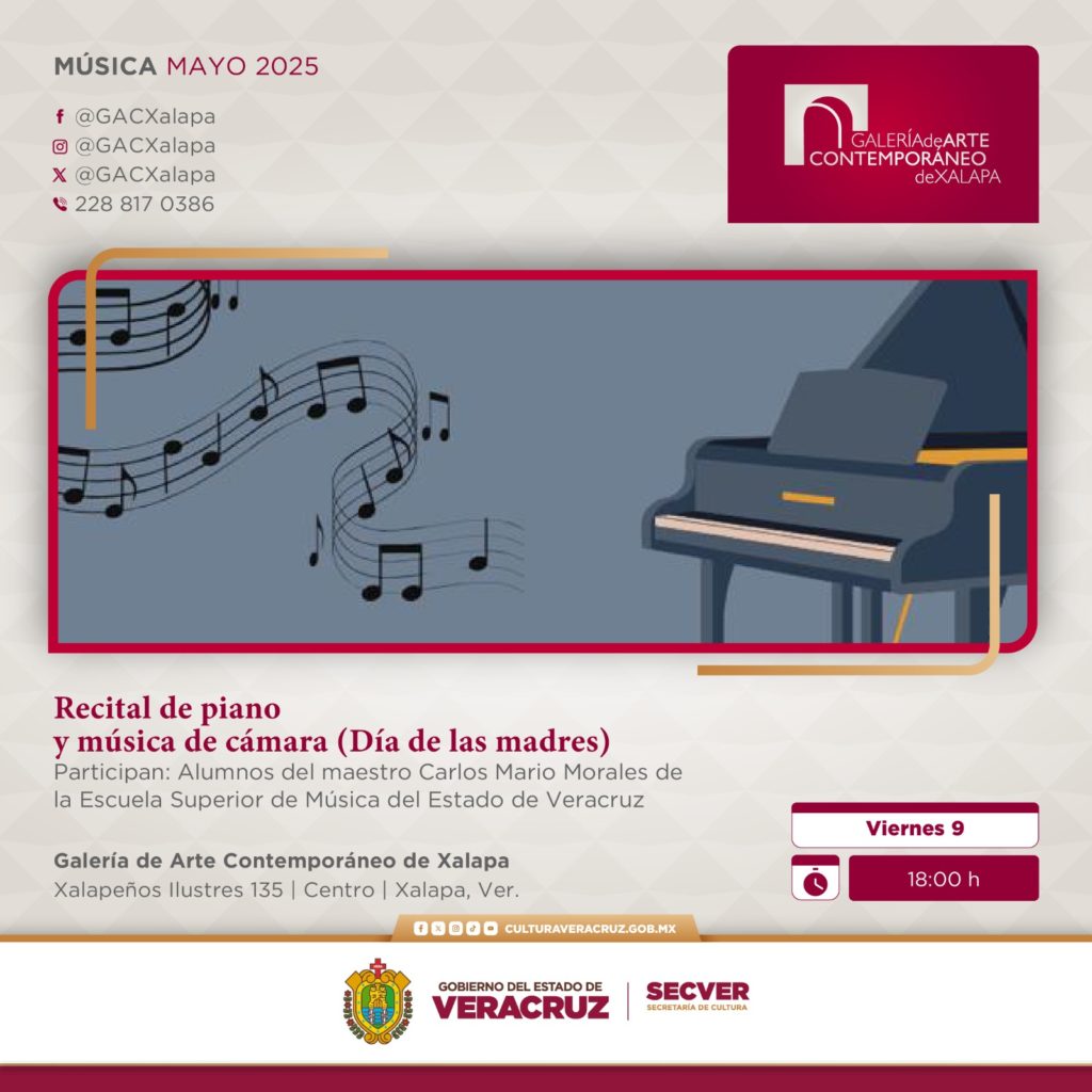 Xalapa, Ver.- La Secretaría de Cultura de Veracruz (Secver) invita a los recitales de este viernes en el Museo de Arte del Estado de Veracruz (MAEV), y en la Galería de Arte Contemporáneo de Xalapa (GACX), con motivo del Día de las Madres. La entrada es gratuita.