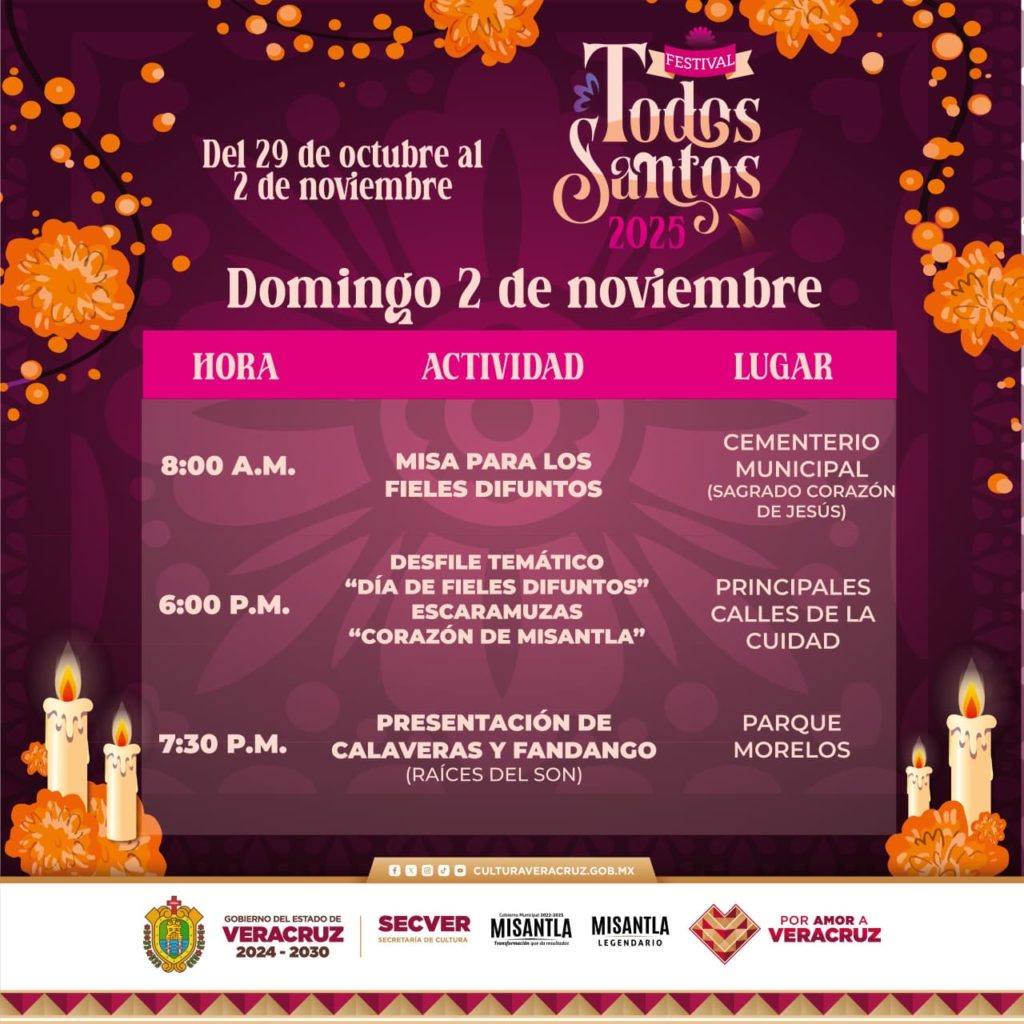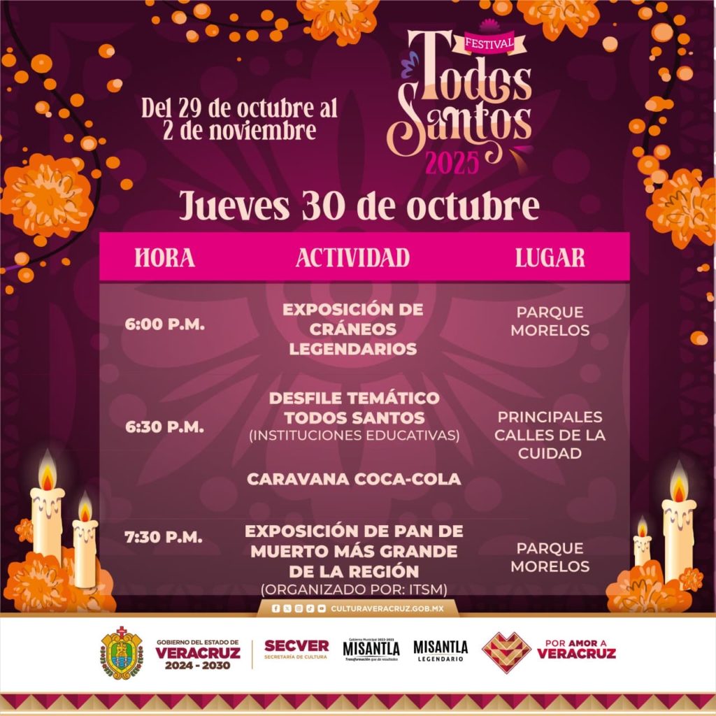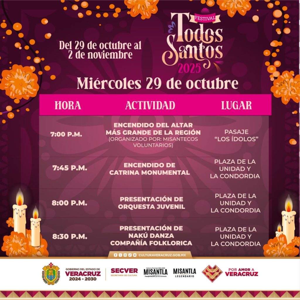 El festival incluye actividades como el encendido del altar más grande de la región y presentaciones escénicas de música y danza, el 29 de octubre; la exposición de cráneos legendarios, el pan de muerto más grande de la región y un desfile temático de todos santos el jueves 30; un panel gastronómico y artesanal, así como una pasarela, el viernes 31; y más desfiles y misas conmemorativas el 1 y 2 de noviembre.