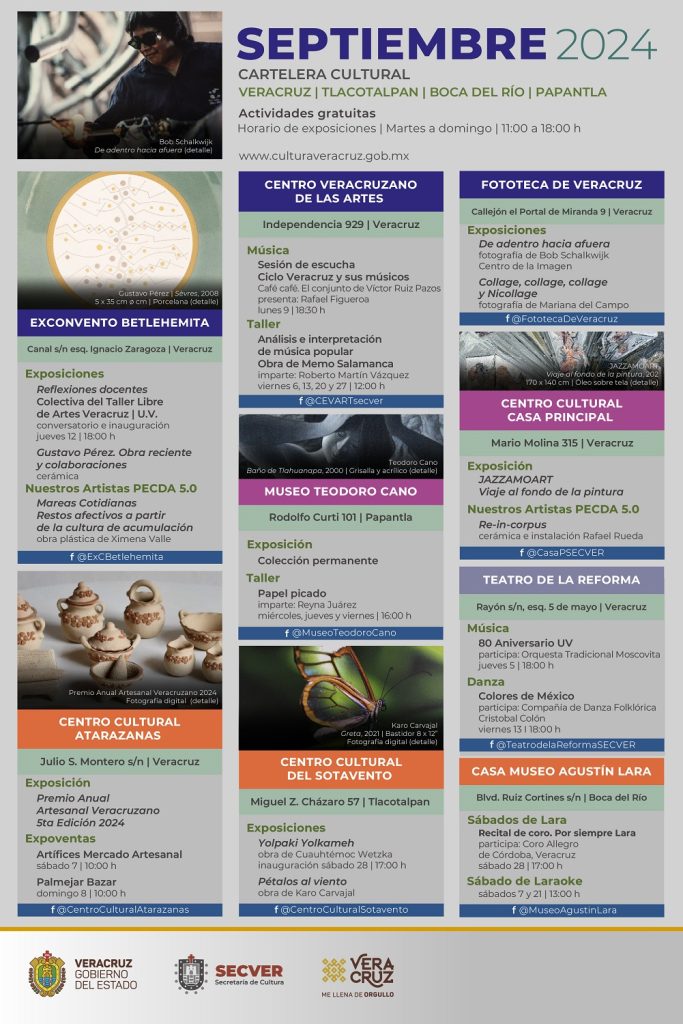 La Secretaría de Cultura de Veracruz presenta una oferta cultural diversa durante el mes de septiembre integrada por exposiciones, conversatorios, talleres, música, teatro, literatura, cine y actividades de fomento a la lectura para todos los públicos. Tendrán lugar en su red de recintos culturales ubicados en Veracruz, Boca del Río, Papantla y Tlacotalpan.