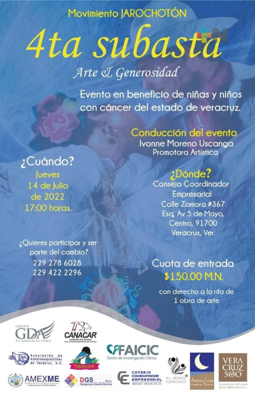 Veracruz, Ver.- Asociaciones civiles se unen a la cuarta subasta arte y generosidad a celebrarse el 14 de julio, el evento es organizado por el movimiento Jarochotón en beneficio de las niñas y niños con cáncer que son atendidos en el Hospital Infantil de la ciudad de Veracruz.