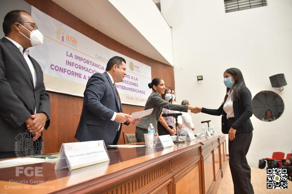Xalapa, Ver.- La Fiscal General del Estado, Verónica Hernández Giadáns, entregó constancias y reconocimientos a las y los servidores públicos del organismo autónomo y a ponentes que participaron en el curso-taller “La importancia del derecho a la información y el régimen excepcional de sus restricciones conforme a los a los estándares interamericanos”, que contó con la participación de destacados ponentes provenientes de la Secretaría de Relaciones Exteriores, del Instituto Nacional de Transparencia, Acceso a la Información y Protección de Datos Personales, de la Universidad Nacional Autónoma de México, de la Universidad de Guadalajara, y de la Universidad Veracruzana.