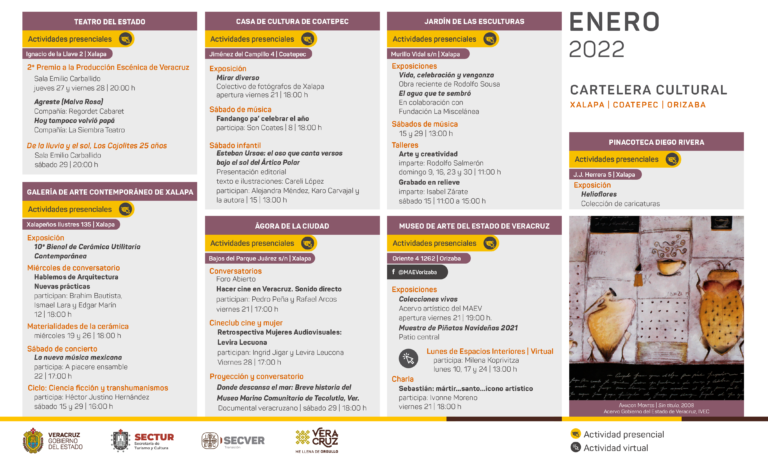 Veracruz, Ver.- El Instituto Veracruzano de la Cultura inicia el 2022 con una variada oferta cultural, conformada por actividades presenciales; exposiciones, proyecciones cinematográficas, conversatorios, talleres, presentaciones editoriales y artísticas que se realizarán durante el mes de enero en su red de recintos culturales de Xalapa, Coatepec, Veracruz, Boca del Río, Orizaba, Papantla y Tlacotalpan.
