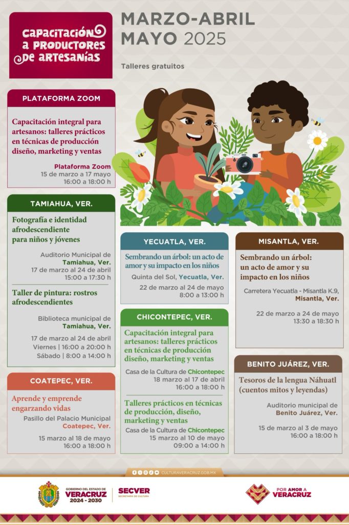 Xalapa, Ver.- La Secretaría de Cultura de Veracruz (Secver), a través de la Dirección de Desarrollo Cultural Regional, invita a las artesanas y artesanos del Estado a sumarse a la jornada de Capacitación a Productores de Artesanías, que se llevará a cabo durante los meses de marzo, abril y mayo en diferentes sedes de la entidad, los talleres son gratuitos.