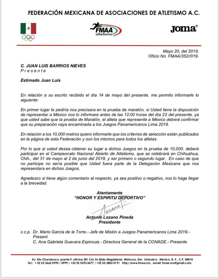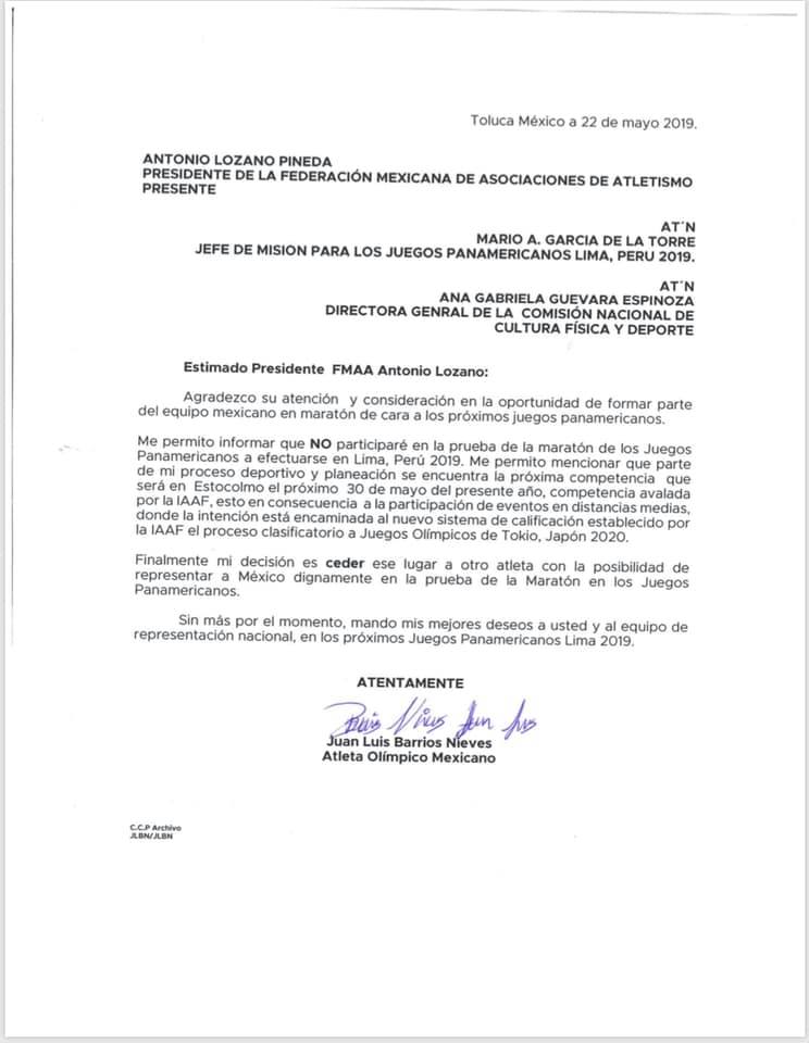 México.- Mediante una carta publicada en sus redes sociales el internacional fondista mexicano Juan Luis Barrios Nieves aclaró su eventual ausencia en los próximos Juegos Panamericanos Lima 2019.
