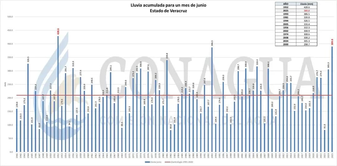 El Organismo de Cuenca Golfo Centro de la Comisión Nacional del Agua (Conagua) dio a conocer que el mes de junio de 2025 fue el segundo más lluvioso registrado en Veracruz desde 1944, ya que se acumularon 389.8 milímetros de lluvia, casi el doble del promedio climatológico de junio (206 mm, periodo 1991-2020).
