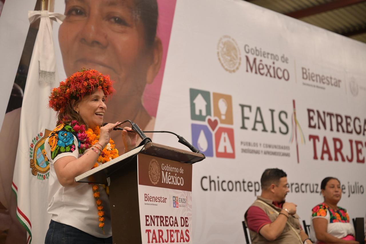 Chicontepec, Ver.- Desde la Huasteca veracruzana, la gobernadora Rocío Nahle García y la secretaria de Bienestar, Ariadna Montiel Reyes, encabezaron la entrega de 183 tarjetas bancarias con recursos del Fondo de Aportaciones para la Infraestructura Social para Pueblos y Comunidades Indígenas y Afromexicanas (FAISPIAM), con una inversión de 59 millones 731 mil 240 pesos.