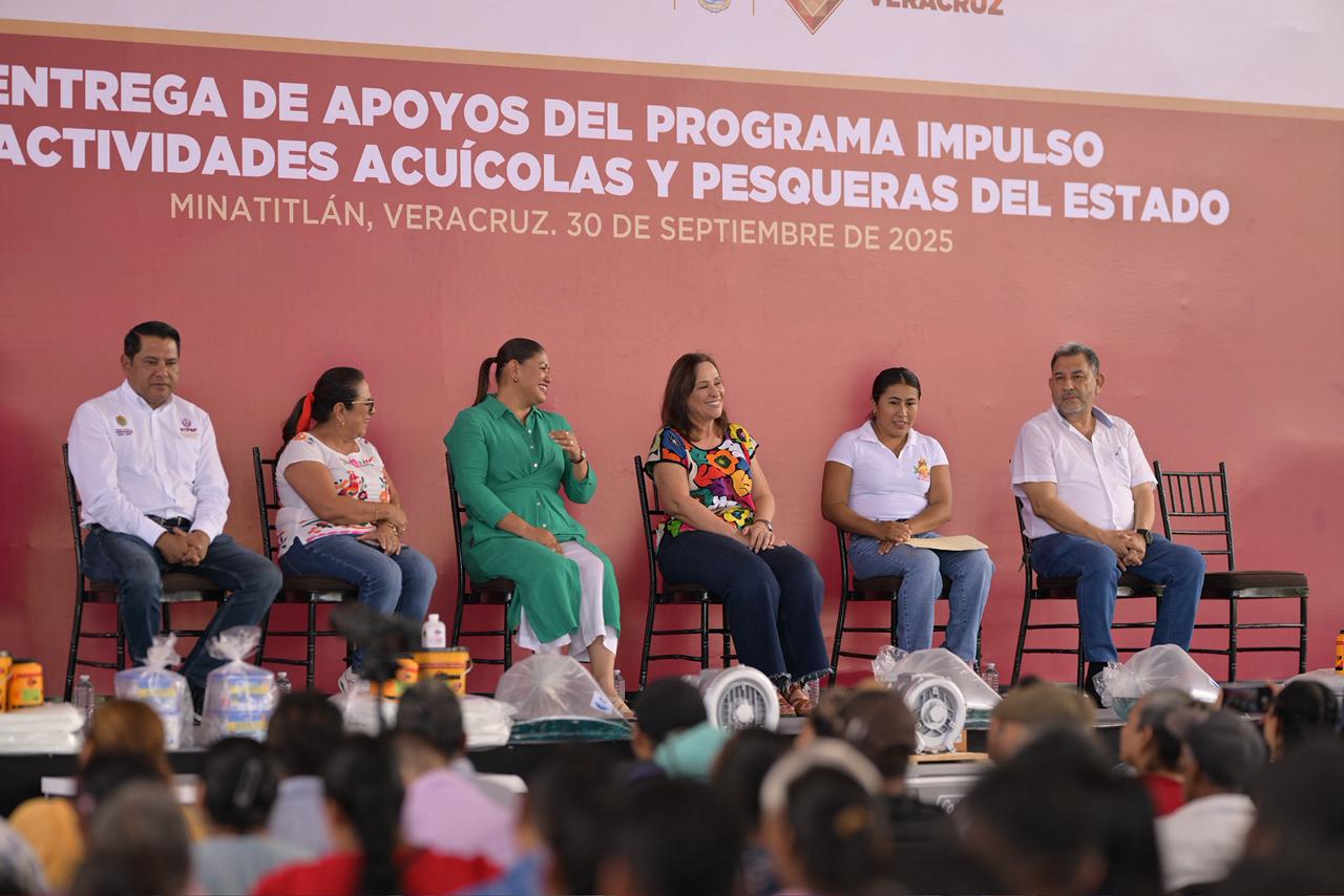 Minatitlán, Ver.- Porque la pesca y la acuacultura son prioridad nacional al garantizar alimentos de calidad, empleos e ingresos que impulsan el desarrollo, la gobernadora Rocío Nahle García encabezó la entrega de insumos y equipos del programa Fomento a las Actividades Acuícolas y Pesqueras, implementado por la Secretaría de Desarrollo Agropecuario, Rural y Pesca (Sedarpa).